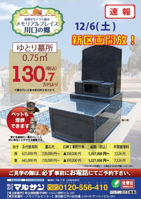 霊園・墓地情報 埼玉県 さいたま市・川口市他の霊園・墓地 メモリアルプレイス川口の郷(川口市) 霊園ID:2204 PICK UP民間 霊園入口付近 管理棟 管理棟 駐車場 園内はバリアフリー 開放感を感じられる墓域 緑あふれる園内 テラス型墓所 欧風な雰囲気のある墓域 整備されら参道 墓域 外環自動車道近くの立地 水場 水場 埼玉県川口市西新井宿1296最寄駅埼玉高速鉄道「新井宿駅」 バリアフリーペットと一緒交通至便宗派問わず施設・設備充実景色が良い駐車場完備 価格 総額109.8万円より 全て含んだ料金(管理料を除く)。永代使用料は非課税。 石碑工事割引券<10万円>をご利用いただけます! 近隣初、全区画テラス墓所の特別感と緑につつまれたプライベート空間。全区画最愛のペットと共に眠れるお墓です。園内は段差のないバリアフリー設計、充実の施設を備え皆様に安心してお参りいただけます。 この霊園・墓地についてのお問い合わせはこちら お問い合わせ見学・空き確認・資料請求 0120-886-970 お問い合わせ番号:2204 フォトギャラリー 霊園入口付近 管理棟 管理棟 駐車場 園内はバリアフリー 開放感を感じられる墓域 緑あふれる園内 テラス型墓所 欧風な雰囲気のある墓域 整備されら参道 墓域 外環自動車道近くの立地 水場 水場 価格表 墓所名称面積(m²)永代使用料(非課税)墓石工事費(税込み)合計(税込み)年間管理料(税込み)芝プレートタイプ0.75㎡625,000円~473,000円~1,098,000円~7,920円芝フリーデザイン0.80㎡660,000円~572,000円~1,232,000円~9,900円ゆとり墓所0.75㎡625,000円~682,000円~1,307,000円~7,524円テラス墓所1.00m²800,000円~759,000円~1,559,000円~7,920円 ※税込み表記です(永代使用料は非課税。管理料も税込み) ※永代使用料には、安心パック利用料が含まれています。 ※石碑工事割引券<10万円>をご利用いただいた金額です。 ※基本彫刻(家名・建立者・家紋)は上記価格に含まれています。 所在地・事業主体 事業主体 宗教法人 普門寺 所在地 埼玉県川口市西新井宿1296 電車・バス 埼玉高速鉄道「新井宿駅」より国際興業バス【東浦和駅行き】・【コミュニティバス】バス停「石神下」下車徒歩約3分 埼玉高速鉄道「戸塚安行駅」より【コミュニティバス】バス停「石神中」下車徒歩約7分 JR武蔵野線「東浦和駅」より国際興業バス【新井宿行き】バス停「石神中」下車徒歩約7分 お車 東京外環自動車道「川口東I.C.」から約4分、「川口西I.C.」から約6分 この霊園・墓地についてのお問い合わせはこちら お問い合わせ見学・空き確認・資料請求 0120-886-970 お問い合わせ番号:2204 令和7年12月6日より、新区画「ゆとり墓所」の受付を開始いたしました。 人気の区画となっておりますので、ぜひお早めにマルサンまでお問い合わせください。 詳しくはチラシをご覧ください。 近隣の霊園紹介 メモリアルパーク川口山王(川口市) 埼玉県川口市赤山249-1 最寄駅埼玉高速鉄道「新井宿駅」 販売終了となりました 全て含んだ料金(管理料を除く)。永代使用料は非課税。 バリアフリー交通至便宗派問わず施設・設備充実景色が良い駅から近い駐車場完備 詳細を見る むさしの聖地 永久の郷(さいたま市) 埼玉県さいたま市緑区大門2001-2 最寄駅埼玉高速鉄道「浦和美園駅」 販売終了となりました バリアフリー交通至便宗派問わず施設・設備充実景色が良い駅から近い駐車場完備 詳細を見る