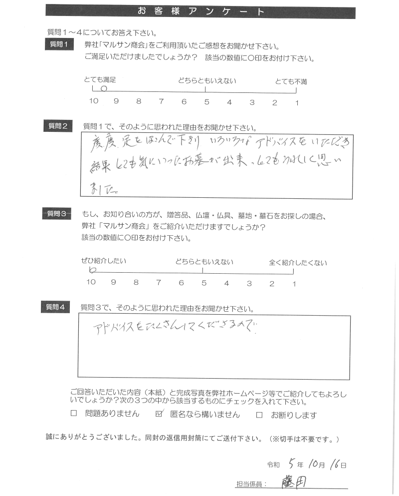 度々足を運んで下さり、色々なアドバイスをいただき結果とても気に入ったお墓ができ、とても嬉しく思いました。