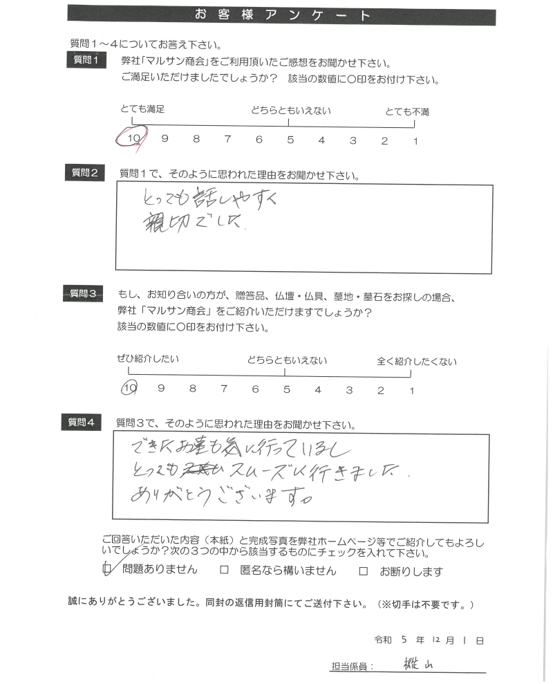 できたお墓も気に行っているしとってもスムーズにいきました。ありがとうございます。