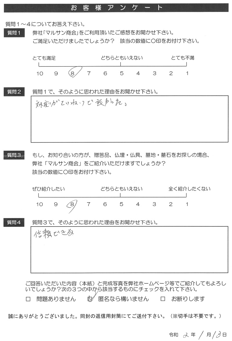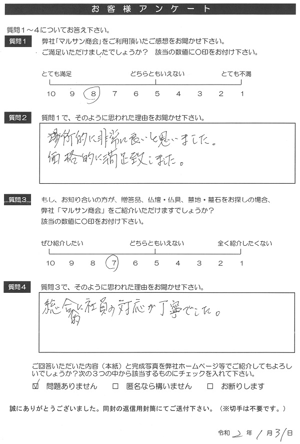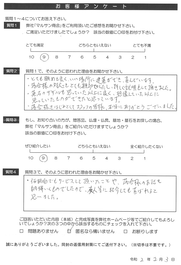 お墓を建てられたお客様アンケート(更新日:2025年09月15日) 男性02 建立墓地: やすらぎの里 南葉山霊園(横須賀市) 詳細を見る 建立墓地: 成田メモリアルパーク(成田市) 詳細を見る 男性02 建立墓地: 湘南公園墓地 茅ヶ崎霊園(茅ヶ崎市) 詳細を見る 女性01 建立墓地: 湘南公園墓地 茅ヶ崎霊園(茅ヶ崎市) 詳細を見る 建立墓地: 弥生台墓園 横浜つどいの森(横浜市) 詳細を見る 男性01 建立墓地: 湘南公園墓地 茅ヶ崎霊園(茅ヶ崎市) 詳細を見る 建立墓地: やすらぎの里 南葉山霊園(横須賀市) 詳細を見る 男性01 建立墓地: 成田メモリアルパーク(成田市) 詳細を見る 建立墓地: 【永代供養墓 宙の碑】都筑港北霊園(横浜市) 詳細を見る 建立墓地: 湘南公園墓地 茅ヶ崎霊園(茅ヶ崎市) 詳細を見る 男性01 建立墓地: 非公開: 環境霊園 みどりの森(横浜市) 詳細を見る 建立墓地: 非公開: 環境霊園 みどりの森グリーンステージ(横浜市) 詳細を見る « 前へ 1 … 5 6 7